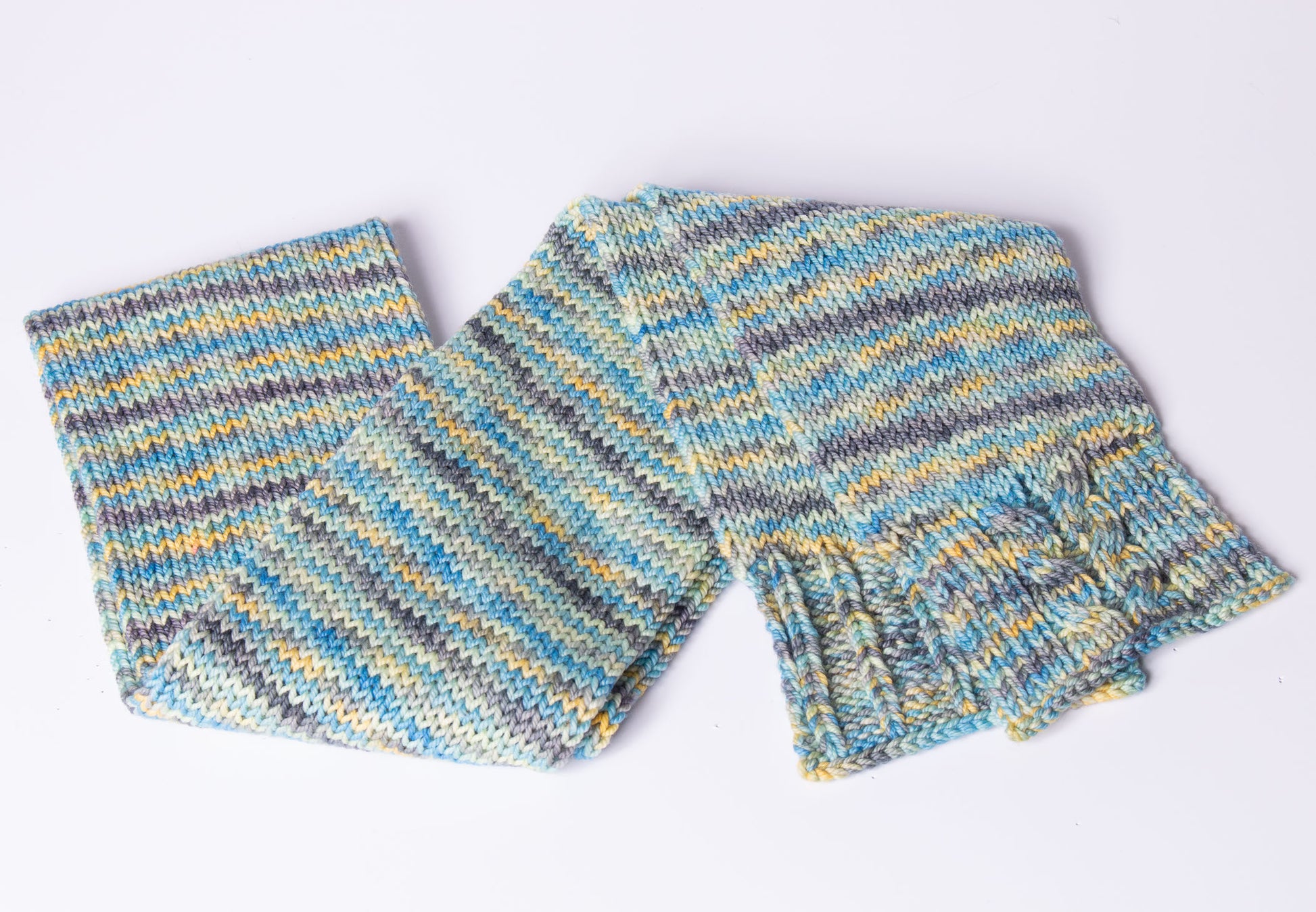Crafted from 100% superwash merino, this handmade scarf features a distinctive pebbled striped motif in soft light green, grey, yellow, and blue tones. The smooth bulky texture provides warmth and visual interest, while the superwash treatment ensures effortless care. Each piece is one of a kind, reflecting the artisanal quality of its hand-crafted construction. Perfect for adding sophisticated texture and color to any ensemble.