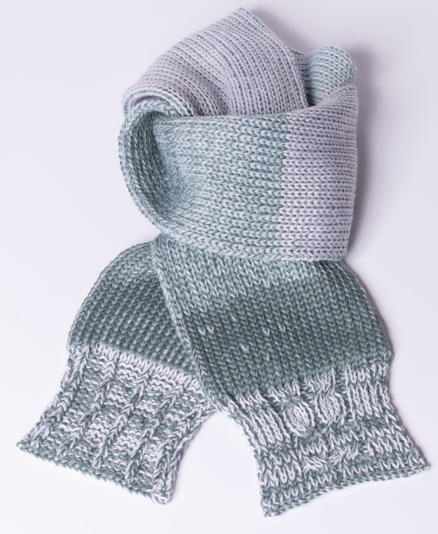 Introducing the Pisces Scarf, a handmade one-of-a-kind piece featuring a sophisticated pebbled peekaboo gradient design. This artisan creation transitions seamlessly through cool neutral green, mint green, light grey, and cream tones, offering versatile styling options for any wardrobe. Crafted from a premium merino and acrylic blend, the scarf delivers exceptional softness and durability while maintaining its shape through wear and washing. The textured surface adds visual depth and tactile interest, making it an elevated accessory that elevates both casual and refined looks.