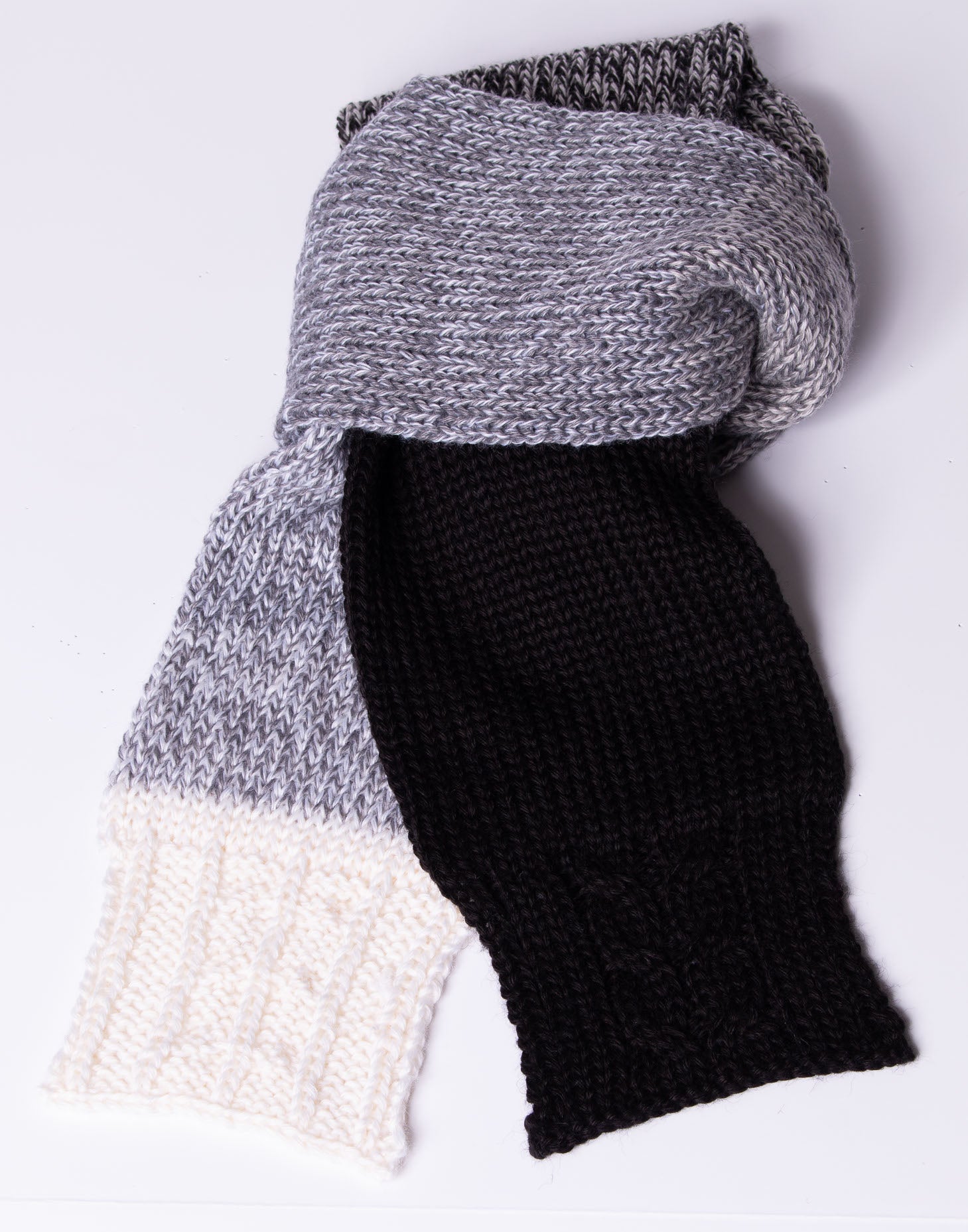 The Scorpius Striped Scarf showcases artisanal craftsmanship with its distinctive color-blocked design featuring gradient transitions and pebbled striping across black, grey, and white tones. Crafted from a premium Merino and acrylic blend, this one-of-a-kind piece delivers luxurious softness with substantial weight and a refined smooth finish. Each handmade scarf is uniquely constructed, ensuring no two are identical. The bulky construction provides exceptional warmth and drape, while the sophisticated palette complements any wardrobe. A statement accessory for those who appreciate quality materials and distinctive design.